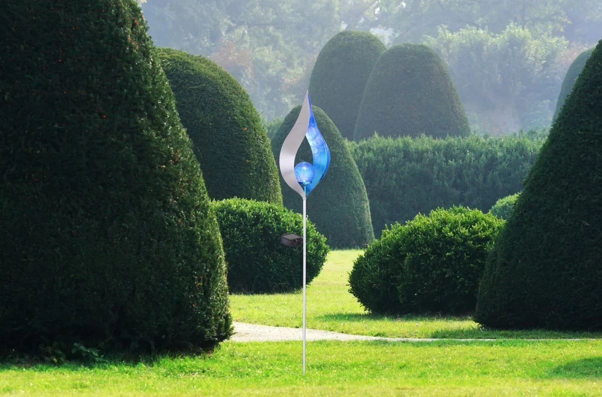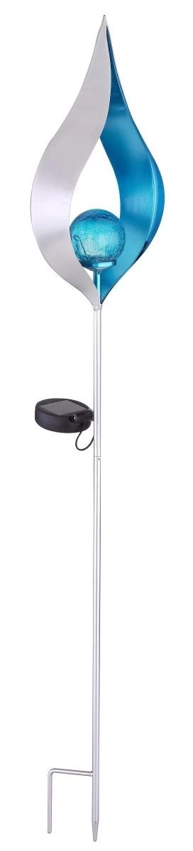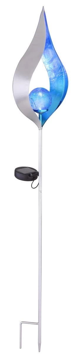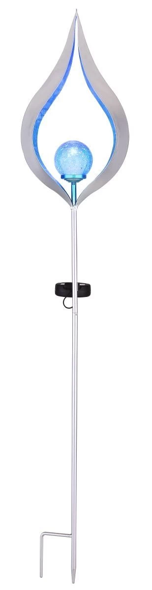 Bereits am Tage schon ein richtiger Hingucker präsentiert diese silberfarbene LED Solarleuchte dank ihrer in der Mitte befindlichen blauen Glaskugel bei Nacht ein faszinierendes Lichtspektakel.