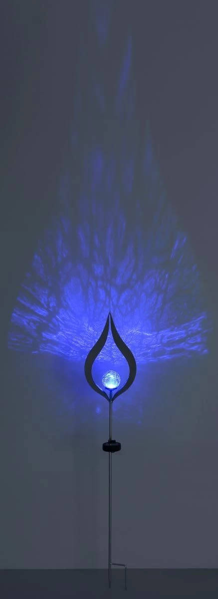 Sobald die Dämmerung eintritt und der Akku geladen ist, beginnt die blaue Bruchglaskugel, welche ein LED beinhaltet, zu leuchten. Das blaue Licht wirft kleine Schatten wie Fäden an die blaue Innenseite des Metalls der Solarleuchte und in ihre Umgebung. Kleine Licht-Schatten Mosaike entstehen.