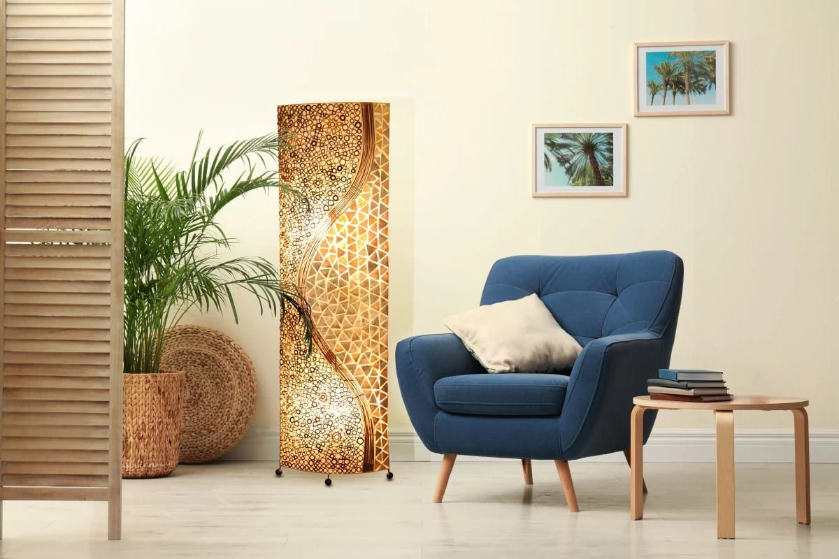 Diese dekorative Stehlampe wird auch Ihren Wohnraum bereichern – entweder als Designobjekt , als Hintergrundbeleuchtung oder als Begleiter Ihrer Sitzgelegenheit .