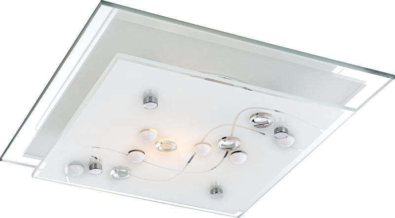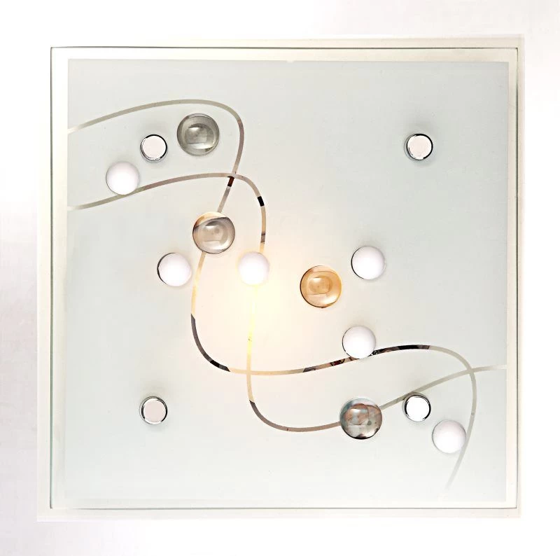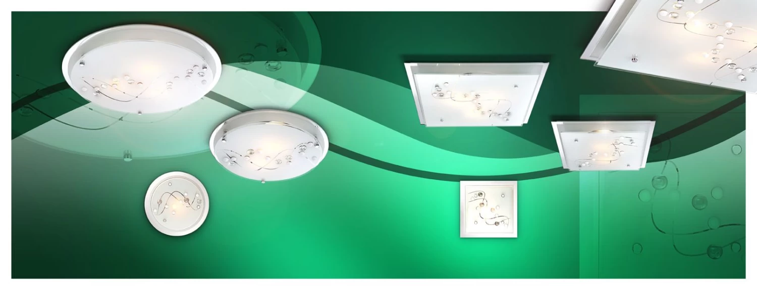 Diese Deckenleuchte überzeugt mit ihrem zeitlosen Design. Auf der quadratischen Grundfläche aus Metall ist eine etwas kleinere, quadratische Glasfläche befestigt. Die Glasfläche ist mit geschwungenen Linien und runden Glaskristallen verziert. Dadurch entsteht ein modisch verspieltes Erscheinungsbild dieses Leuchtobjekts. Natürlich kann dieses Modell auch mit LED-Leuchtmittel betrieben werden, es ist jedoch nicht im Lieferumfang enthalten.