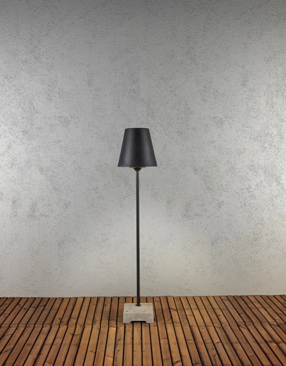 Materialbeschreibung: schwarz lackiertes Aluminium, massiver Betonfuß, Metallschirm