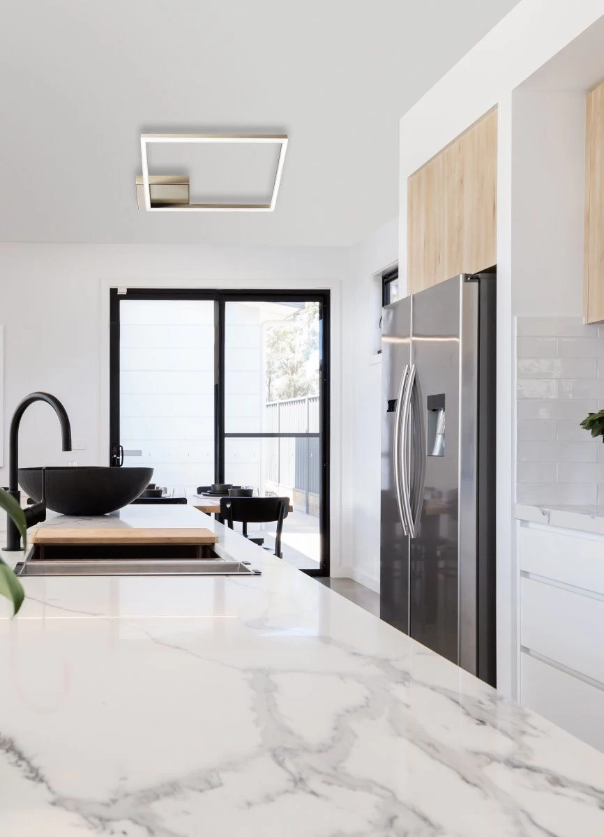 Diese schlichte aber zugleich stilvolle rechteckige dimmbare LED Deckenleuchte besteht aus einem leuchtenden Rahmen in Gold edelmatt mit Methacrylatabdeckung der am einem 170 mm ebenfalls in Mattgold-Finish großen Metallgestell angebracht ist. Die 3510 Lumen verbreiten ein angenehmes warm weißes Licht und sind zudem noch Energiesparend.
