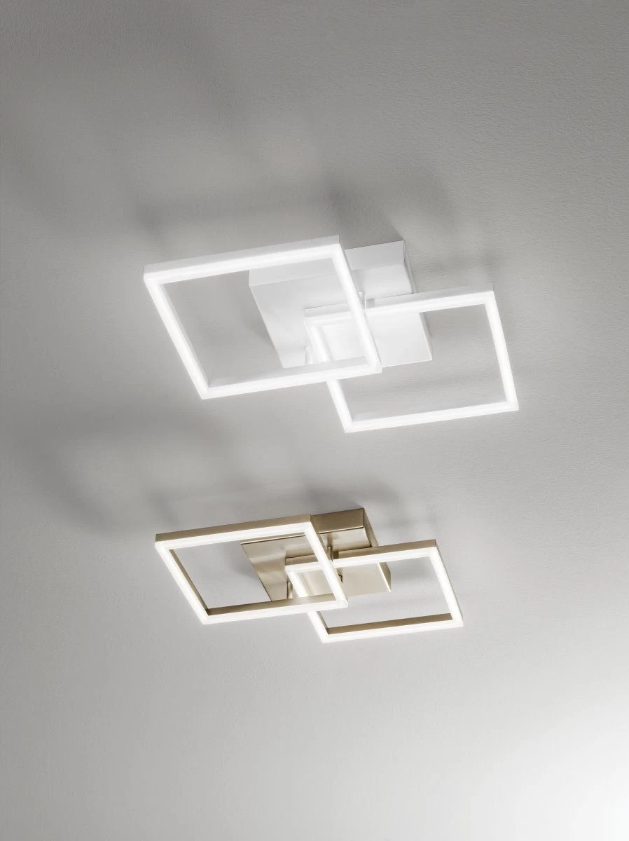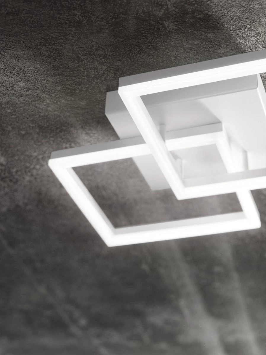 Diese moderne stilvolle Rahmenleuchte besticht mit kreativität und desigen was typisch für den Italenischen Hersteller Fabas Luce ist. Die zwei versetzt angebrachten Rahmen am Metallgestell haben eine Abdeckung aus Methacrylat und geben ein optimales angenehmes warm weißes Licht der verbauten LED ab, die auch dimmbar sind. Wenn Sie etwas besonderes suchen liegen Sie mit dieser Deckenleuchte die alle Blicke auf sich zieht richtig. Ob Wohnzimmer, Esszimmer oder Flur alles ist möglich mit der Serie Bard.