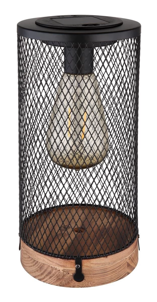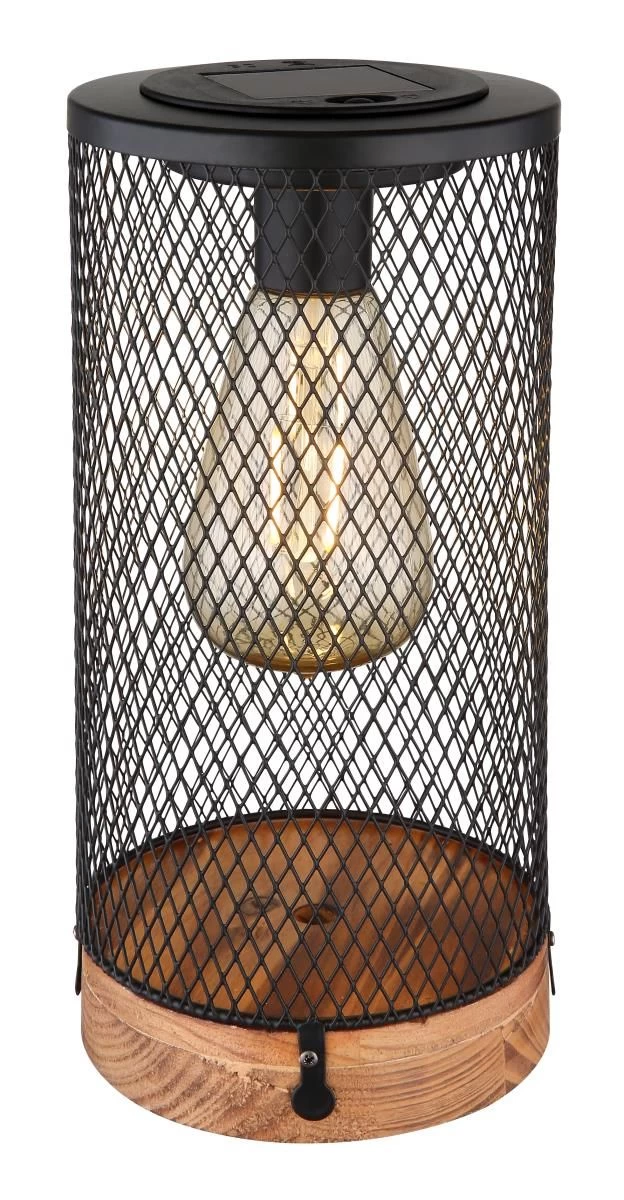 Dank Solarleuchten erhalten Sie ab einsetzender Dämmerung und geladenem Akku ruckzuck stimmungsvolles Licht. Diese Solar Tischleuchte begeistert zudem durch ein tolles Design. Auf einem runden Holzsockel türmt sich ein zylindrischer Schirm aus einem schwarz matten Metallgitter, an dem sich ein LED Leuchtmittel befindet, welches von einem transparenten birnenförmigen Kunststoff umschlossen ist.
