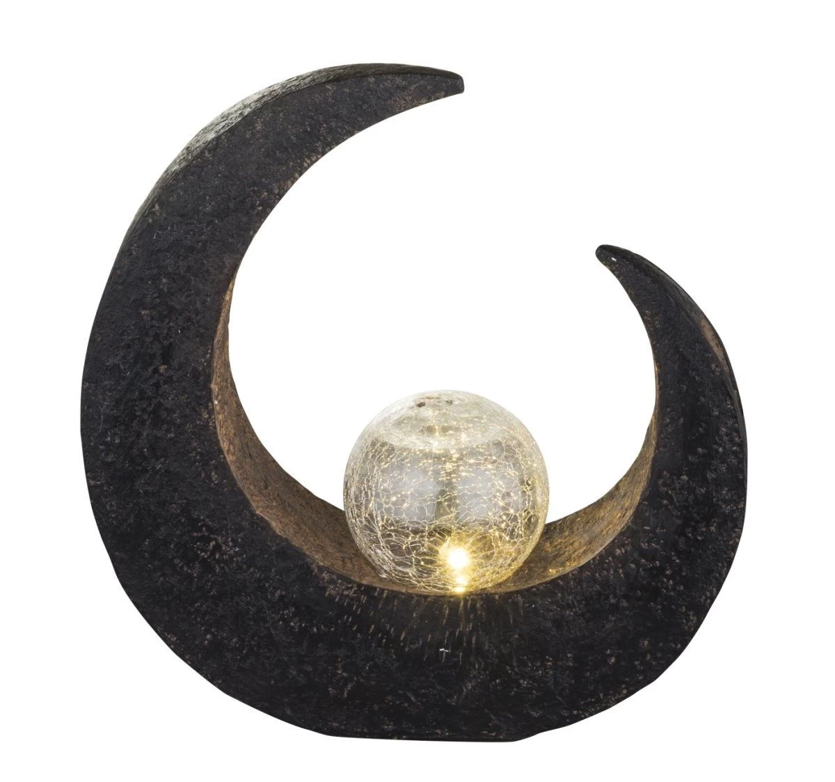 Inmitten des Halbmondes liegt eine Crackle-Glaskugel mit LED Inhalt, das Herzstück der 29,4x9x30,5cm großen Solarleuchte. Bei einsetzender Dunkelheit wird das Licht der LED durch die Kugel in Bruchglasoptik faszinierend gestreut.