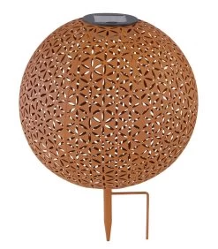 Die insgesamt 380mm hohe rostfarbene Solarlampe mit Erdspieß verbreitet ab Einbruch der Dämmerung wundervoll warmes Licht. Durch die 270mm große Dekorkugel wirft das LED-Licht malerische Schatten.