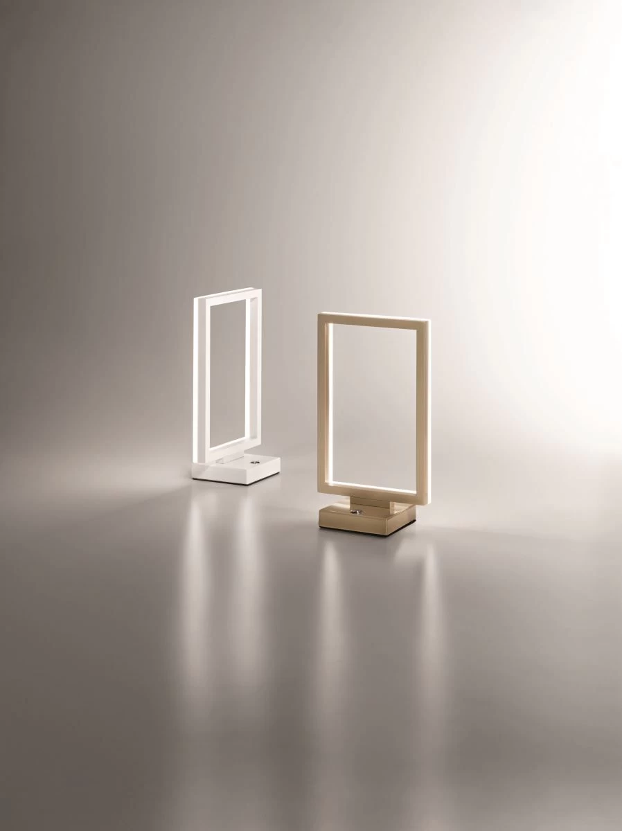 Stilvolle LED Rahmen-Tischleuchte mit zurückhaltender moderner Präsenz in edlem Mattgold-Finish, dimmbar