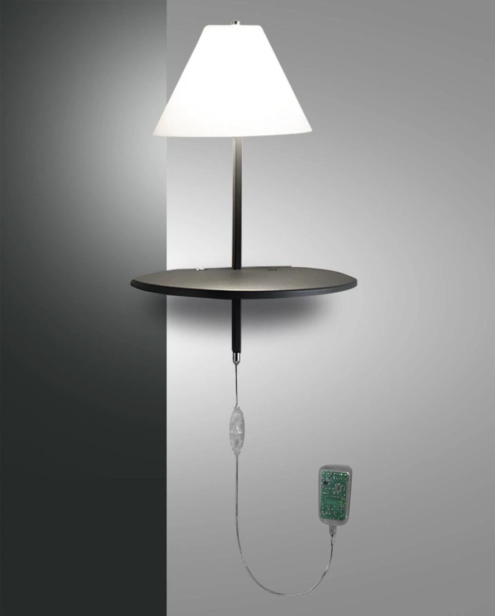 Multifunktionale Tischleuchte in Kombination mit angesetzter Tischablage , integriertem Tastdimmer und USB-Port